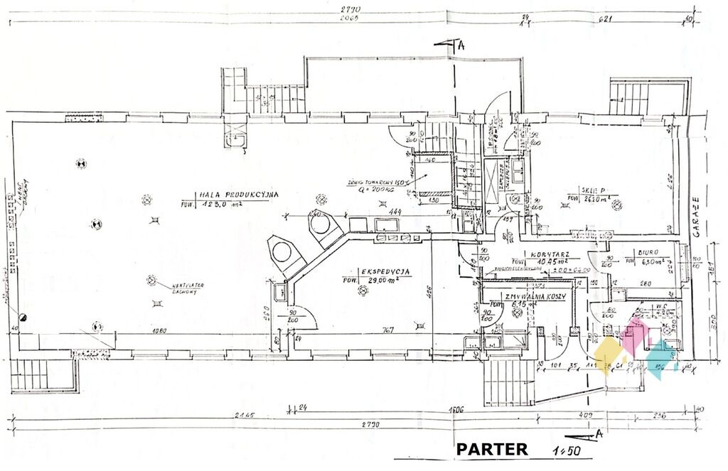 PARTER: hala produkcyjna 123 m2, ekspedycja 29 m2, sklep 26 m2,