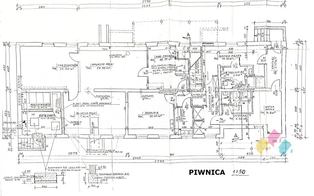 łazienki, 2 x szatnie, biuro, kuchnia, komunikacja, kotłownia.